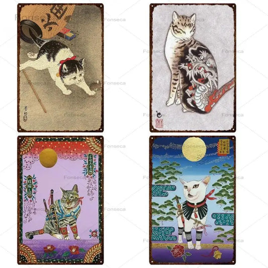 1Pcs Vintage Animals Metal Tin Sign Japanese Samurai Cat Pet Sign Metal Plates For Wall Art Home Decoration Metal Posters Sign